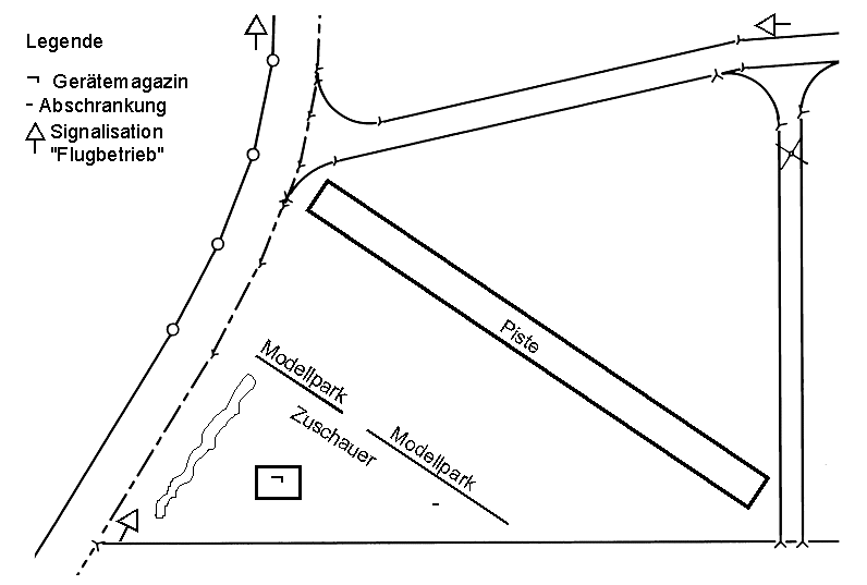 die Mindesthöhe der Bäume. (Keine Tiefflüge über Strasse) Der Luftraum nordwestlich der Piste (Beilage) ist von allen Piloten einzuhalten. Ausnahmen: Segel- und Elektrosegel-Modelle, Helikoptermodelle im tiefen Schwebeflug und generell Modelle mit einem Gesamt-Gewicht unter einem Kilogramm. Es ist strengstens verboten Zuschauer oder andere Personen in geringer Höhe zu überfliegen. Ebenso ist das Überfliegen des Parkplatzes, des Gerätemagazins und des Modellparkes untersagt. Starts und Landungen müssen deutlich angesagt werden. Sind gleichzeitig mehrere Modelle in der Luft, müssen sich die Piloten absprechen und ihren Standort nähe Abschrankung (Kette) festlegen. Der Modellpark befindet sich hinter Kette und südlich hinter dem Gerätemagazin, angrenzend zu Feld. Die Flüge müssen im Register (in Gerätemagazin oder im Briefkasten) eingetragen werden. Bei einer Aussenlandung muss darauf geachtet werden, dass möglichst kein Flurschaden entsteht. |